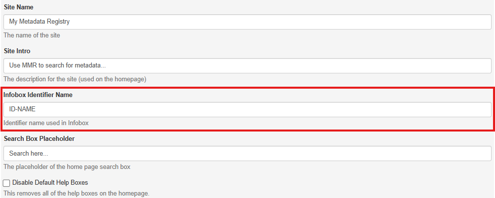 * 'Infobox Identifier Name': The name for identifiers used in metadata item infoboxes. Example below: