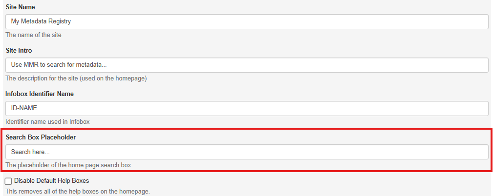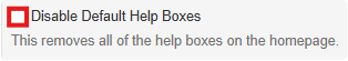 * 'Disable Default Help Pages': Toggles the visibility of help boxes on the homepage.
