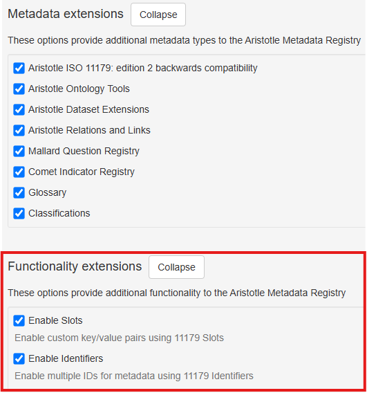 Metadata and functionality extensions can be used to provide additional metadata types, and functionality to the Aristotle Metadata Registry, respectively.