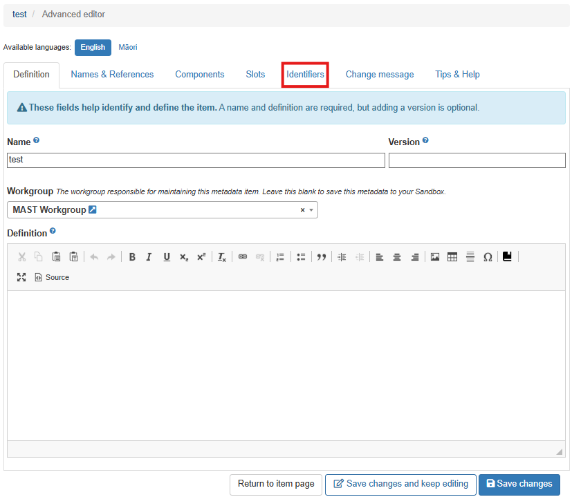 * 'Enable Identifiers': Enables or disables the 'Identifiers' tab in the metadata item editor (below).