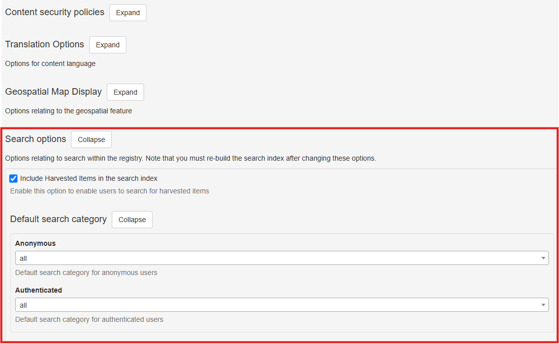 * 'Include Harvested Items in the search index': Enable or disable the ability for users to search for items that have been harvested via the registry's Harvester
