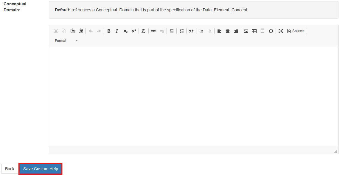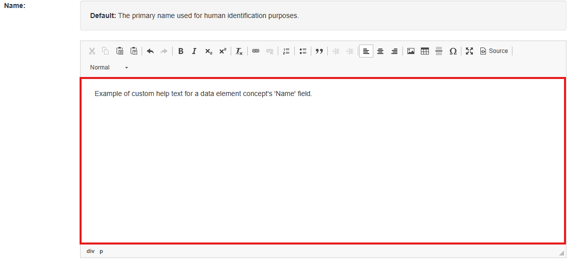 Registry Administrators can configure the help text that appears when users select the question mark beside a metadata item field from an item page or a respective item editor (below). For fields that are shared by multiple metadata item types, this help text can be configured on a per-item-type basis.