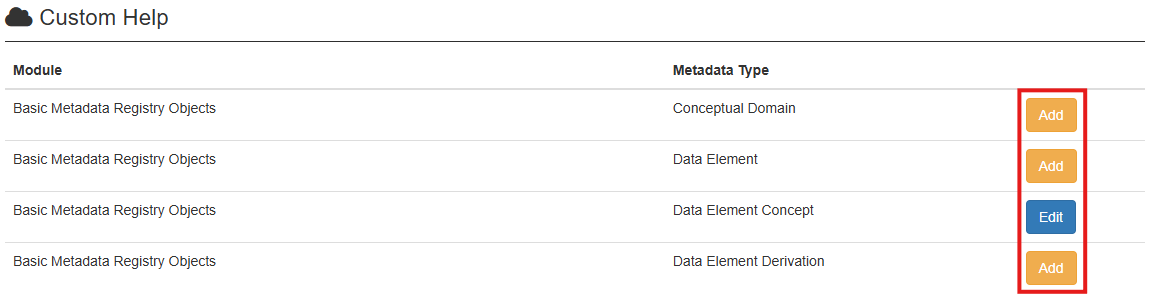 3. Navigate to the metadata item type you wish to add custom help text to a field of, and select 'Add' or 'Edit' from its row.