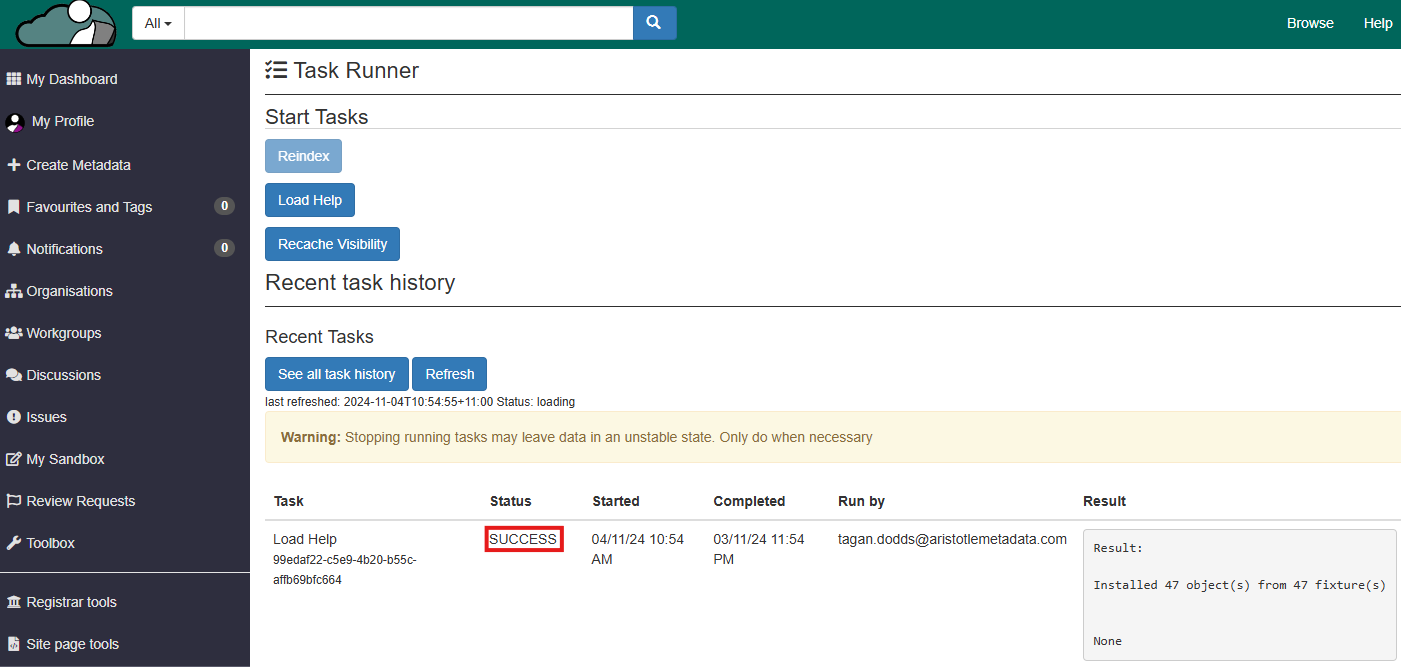 4. Wait for the recent task history to show that the load help task has succeeded.