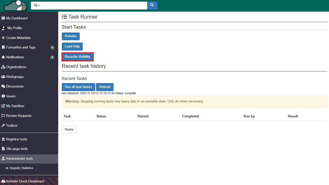 The recache visibility function can be used by an Administrator to resolve issues with item visibility in the registry, such as an item whose visibility should be locked or private showing in unlocked or public locations.