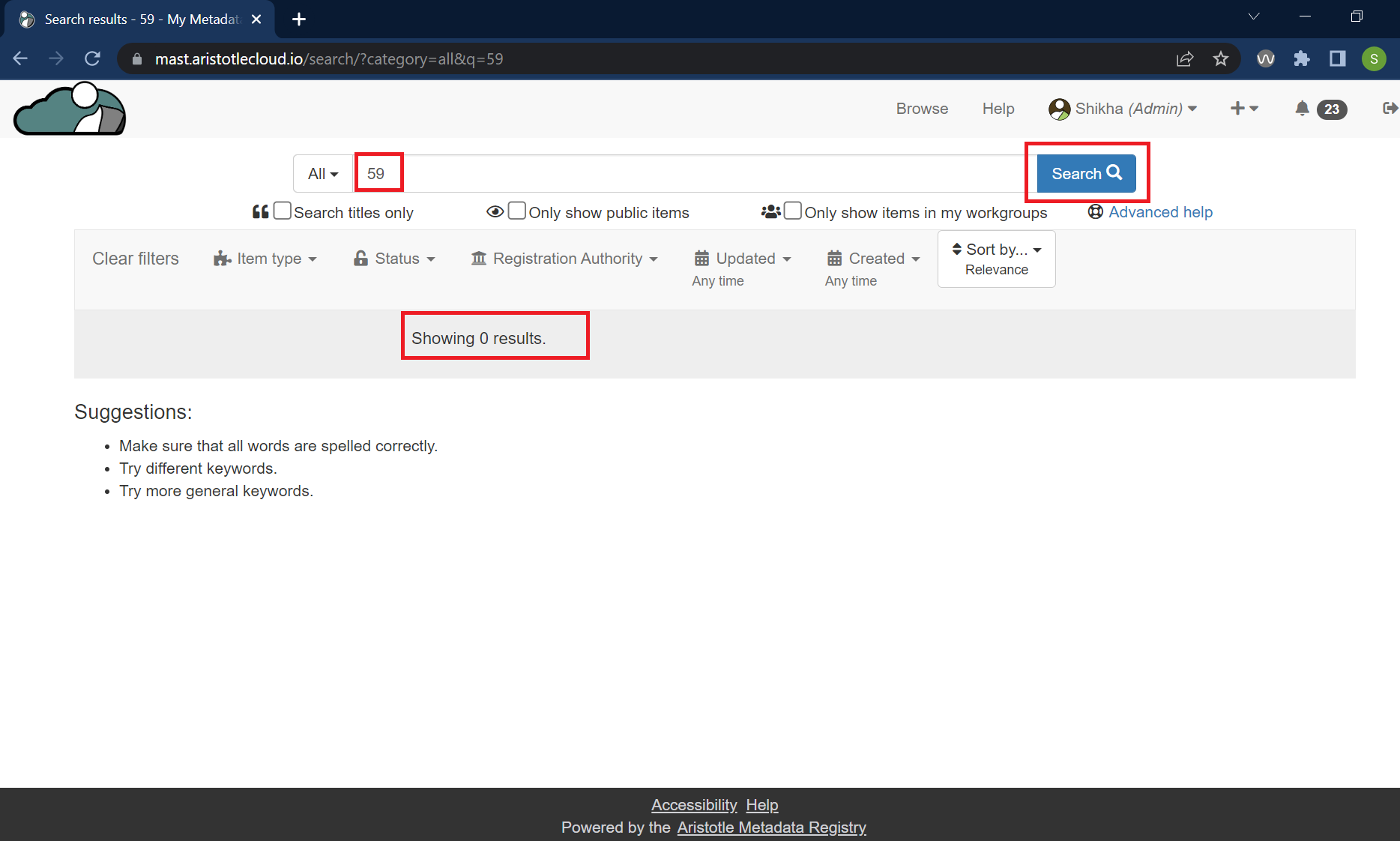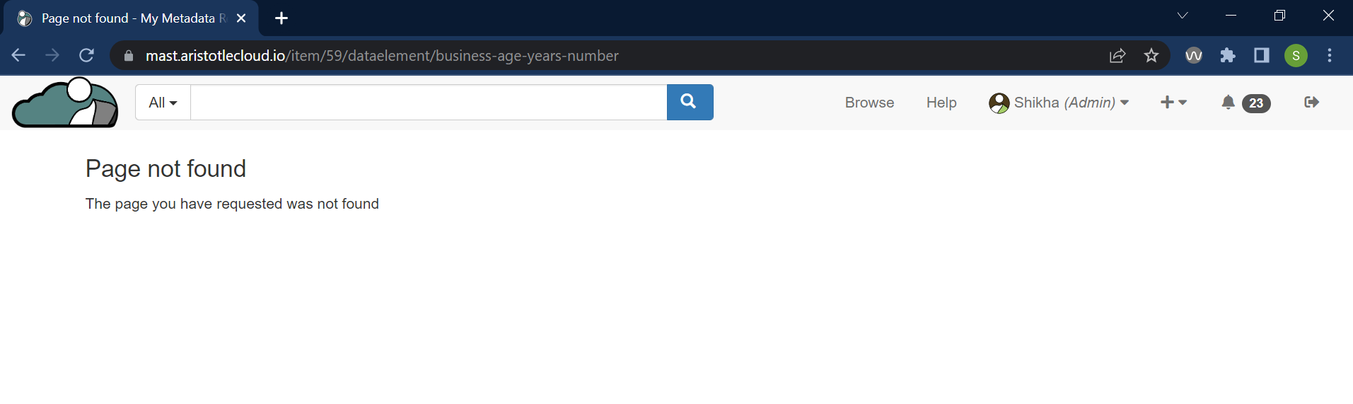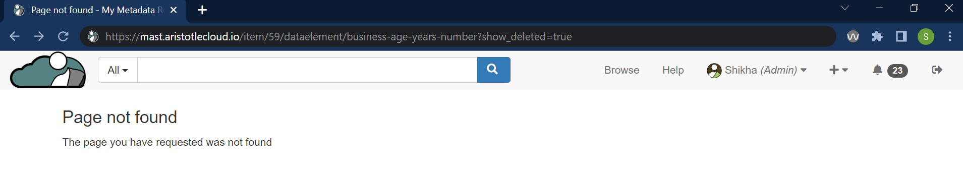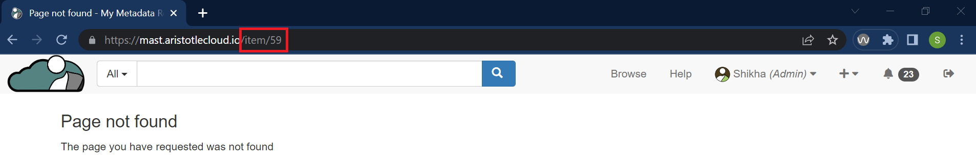 * To view the deleted item, the direct and quick way is to search for the item through a query string. The first step is to add '/item/59' at the end of the registry URL, where 59 is the metadata Id we want to look for in the deleted list and press enter. It will show page not found.