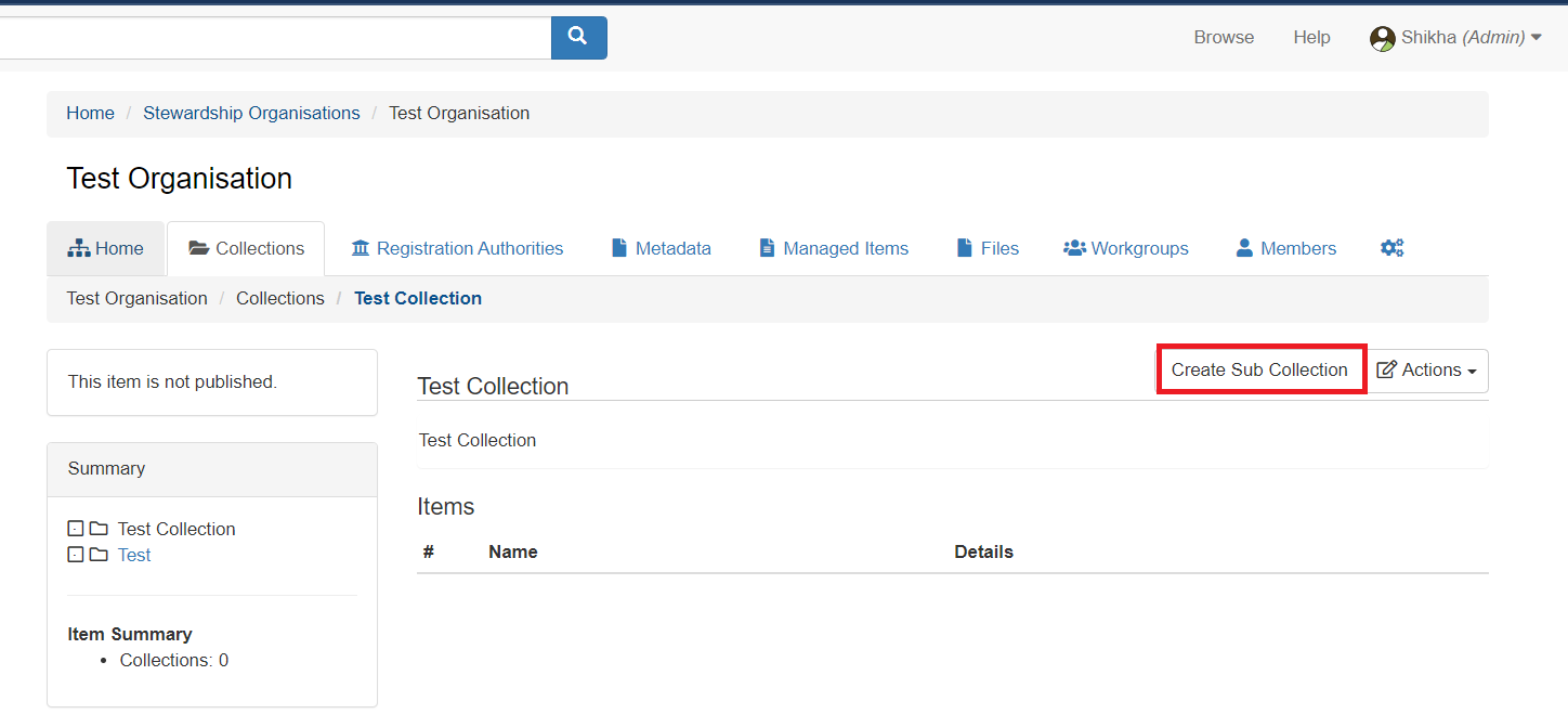 1. Go to stewardship organisation. In the Collections tab, click on the Collection name where you want to create sub collection.