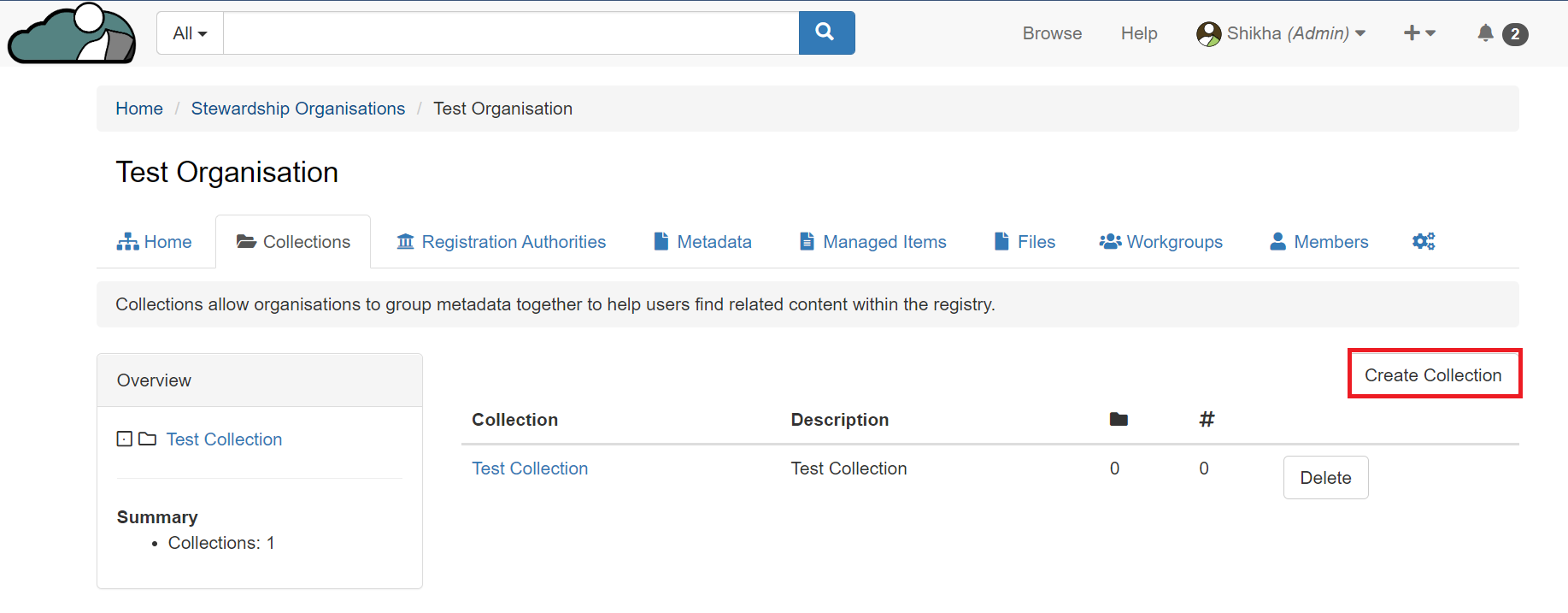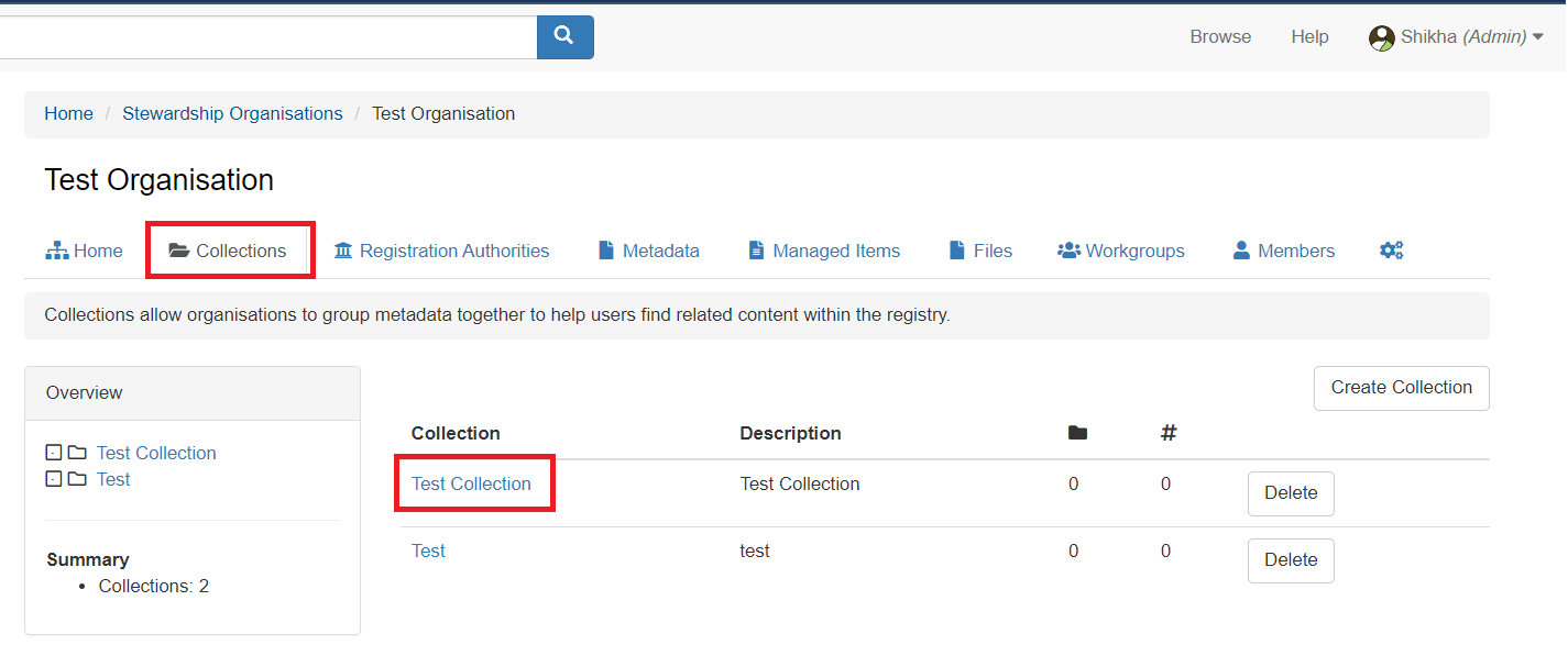 3\. Click on the stewardship organisation name where you want to create collections. Go to the collections tab, click on 'create collection'.