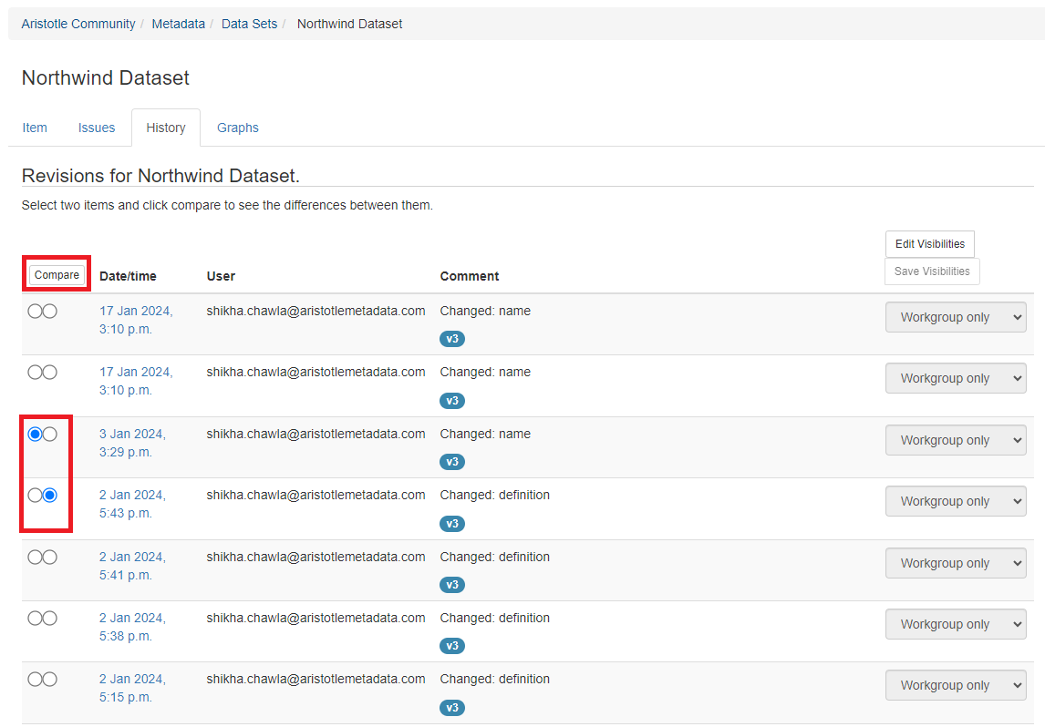 2. You will see a list of all the changes to the metadata item page here, with additional details like Date/time, User, Comments, and visibility settings. Select the two change logs that you want to compare and click on the compare button.