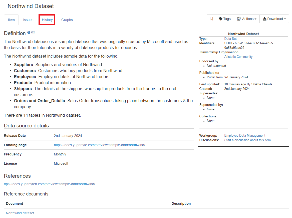 1. Navigate to the metadata item page you want to see or compare change logs for. For instance, I am on the 'Northwind Dataset' item page. On the item page, click on the 'History' tab.