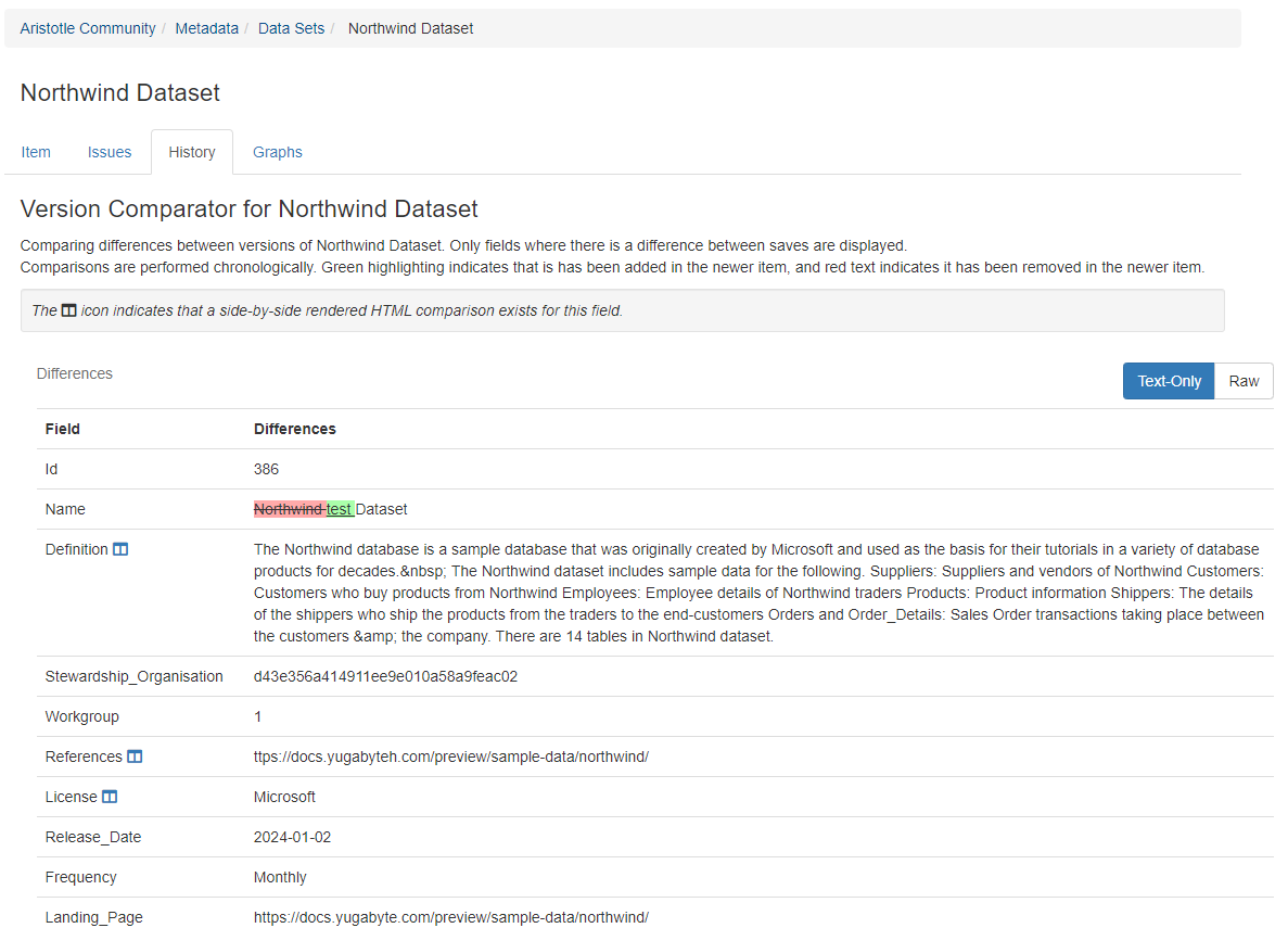 In the Aristotle metadata registry, we can view and compare the change logs for each metadata item. The history/compare feature enables us to track these change logs with additional details, such as the user who made a change and the specific modifications made.