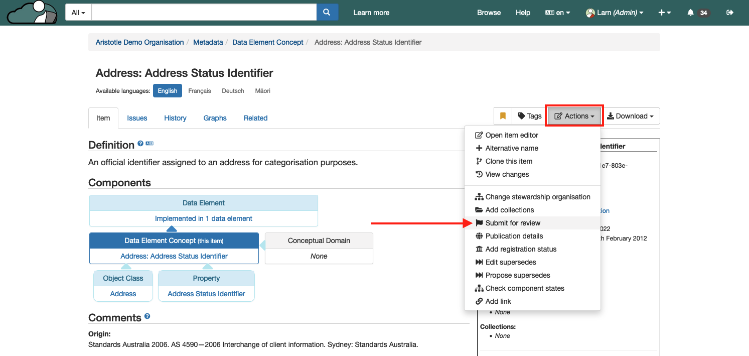 2. From the Actions bar dropdown, select 'Submit for review'.