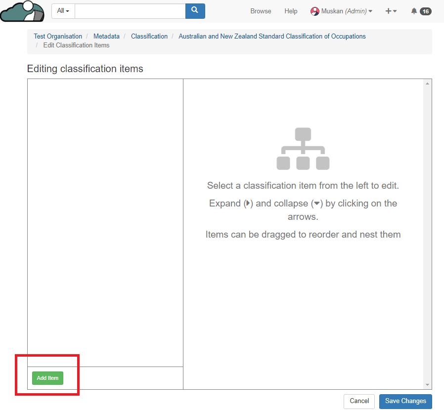 2. User will be navigated to the page where they can start creating the Schema for the Classification. To add the item to the classification, Click on "Add item"