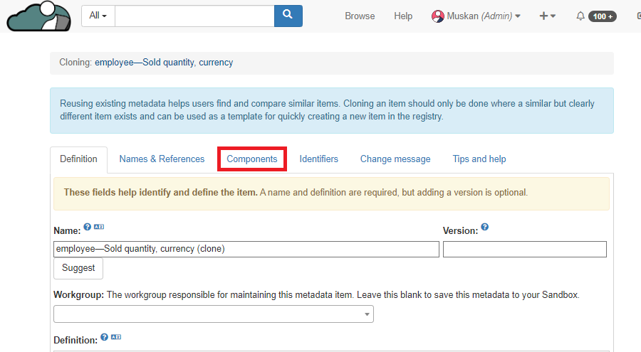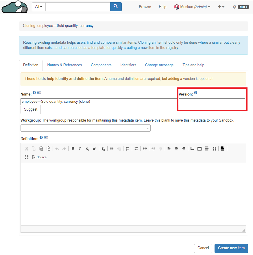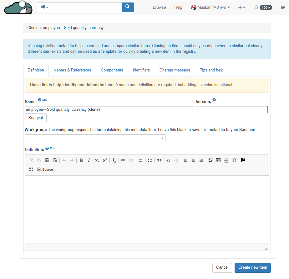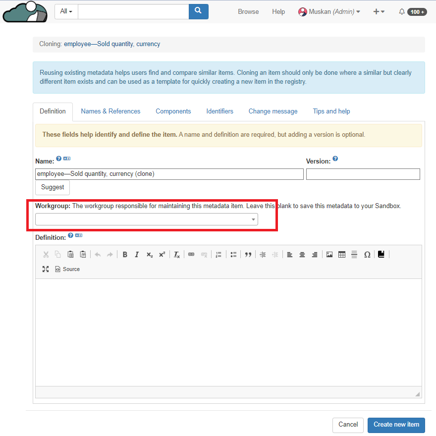 User can also assign this cloned metadata to any workgroup. User can also assign workgroup after creating the item. This cloned version if not assigned to any workgroup with be in the User's Sandbox.
