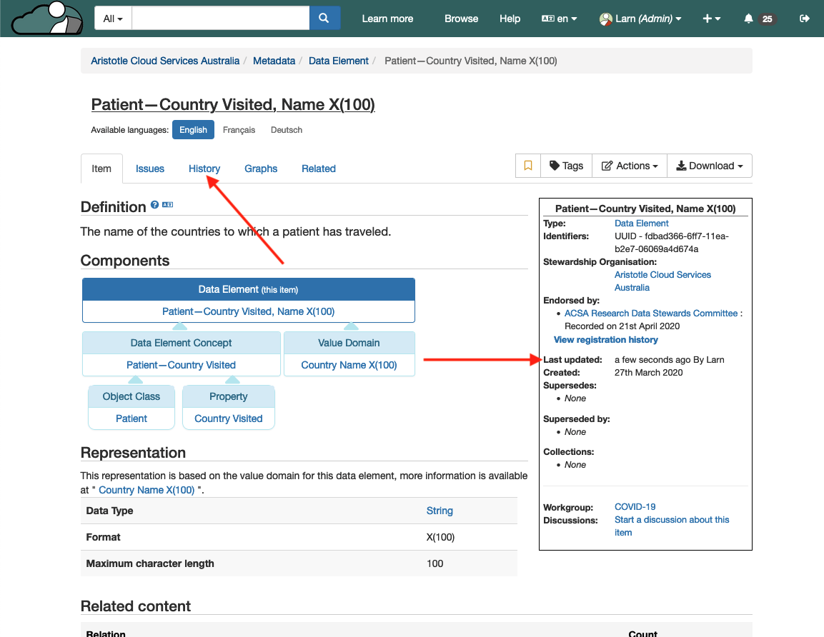 5\. Once the item is saved, you will be taken back to the item page where you can see the update from the 'History' tab on the page and that the item was updated in the item box next to 'Last updated.
