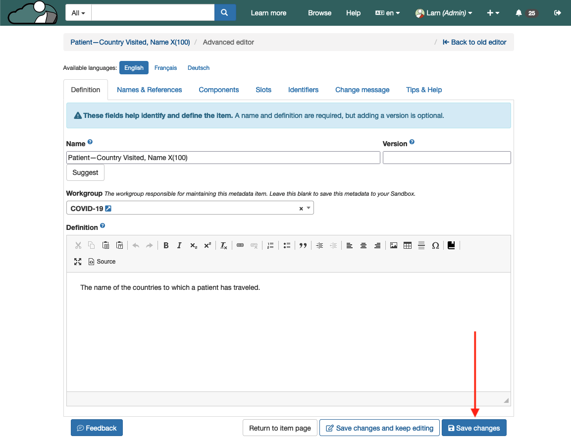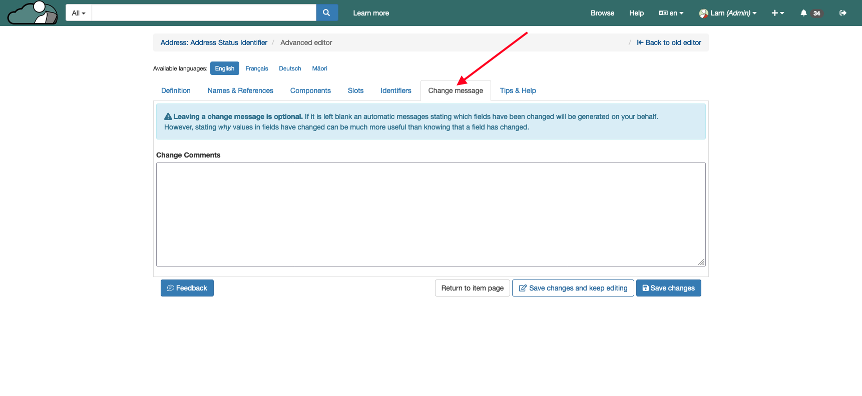 3\. Once you're done editing the item you can add in a change message. If you do not add in a change message an automatic message will be used and displayed on the item page.&#x20;