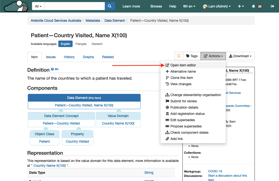 1\. When viewing an item, click the 'Actions' button in the top right of the screen to open the Actions menu, then select 'Open item editor'.