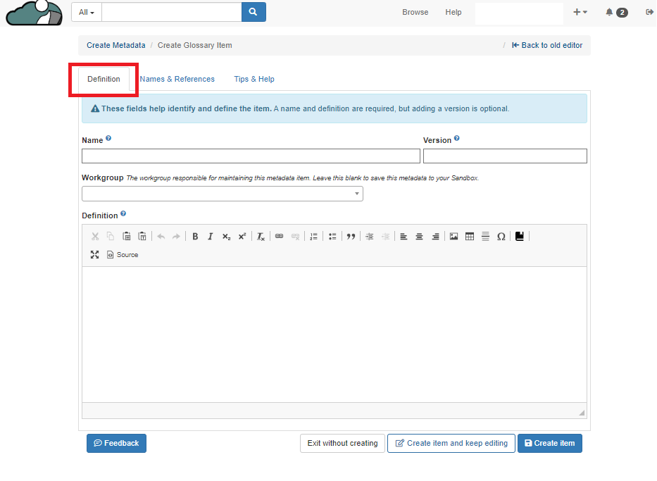 * **Definition:** under this tab, you can name and define you glossary item.&#x20;