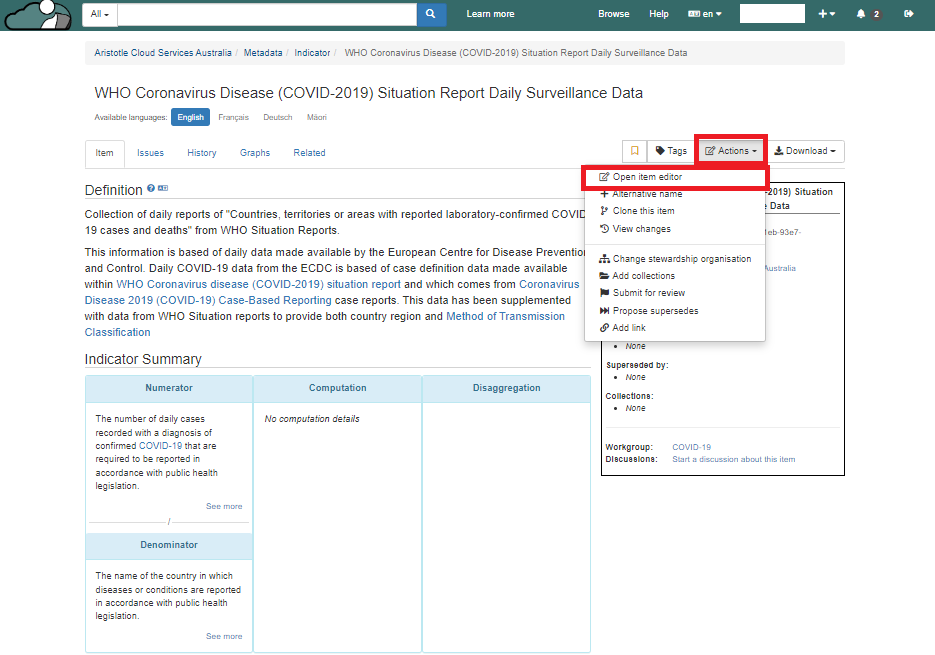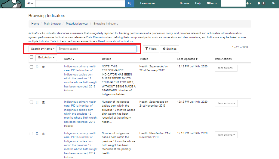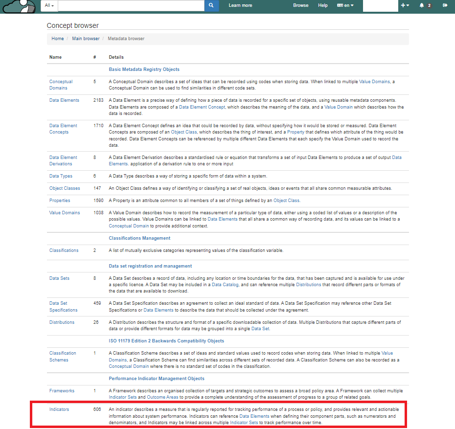 2\. Scroll down to "Indicators". After click on it, you would be navigated to the metadata having all the indicators in the registry.