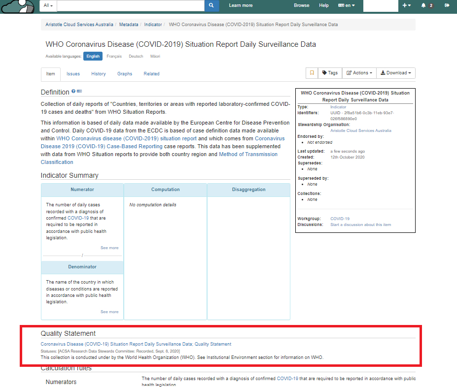 A Data Quality Statement records any known issues that may be related to a data asset. A Data Quality Statement assesses data against seven key factors: Institutional Environment, Relevance, Timeliness, Accuracy, Coherence, Interpretability & Accessibility.