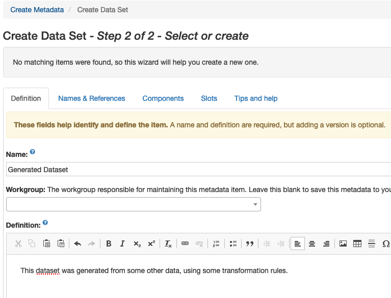 2\. Give the Data Set a name and definition, select the Workgroup if required, and click the Create Item button.&#x20;