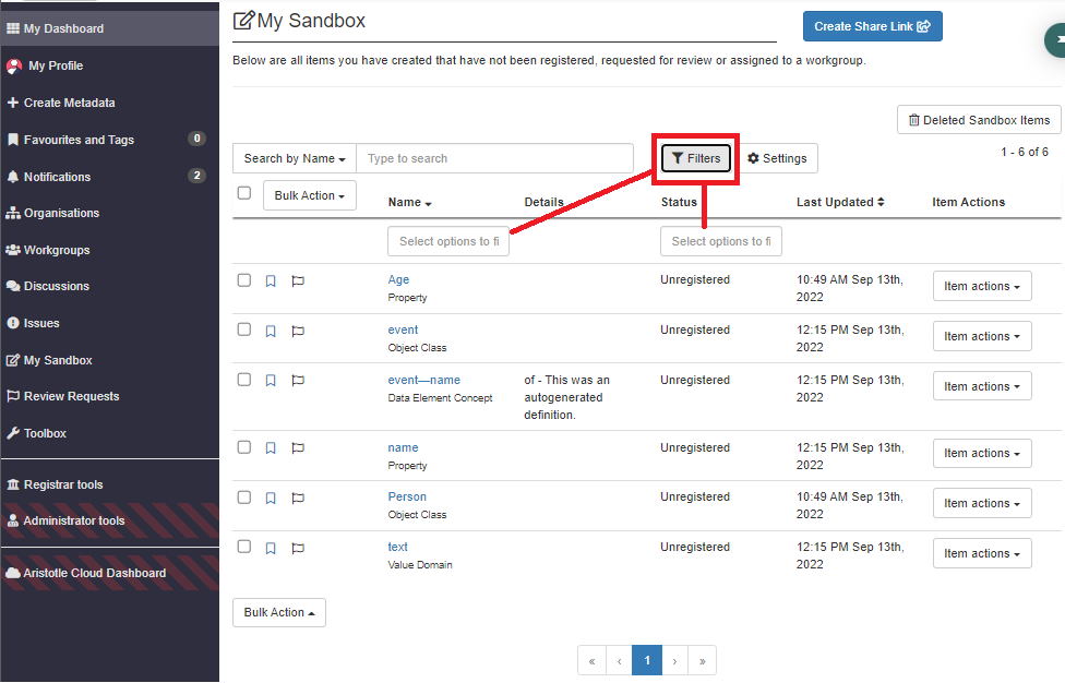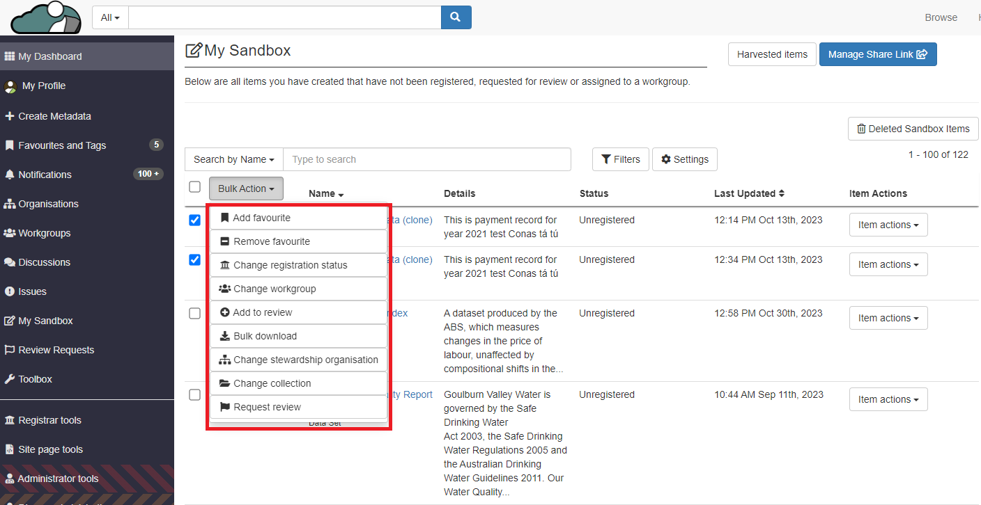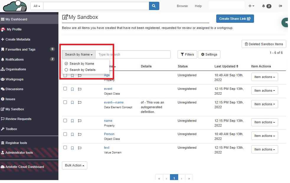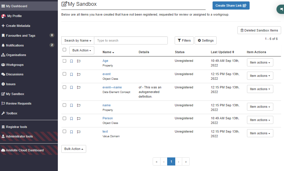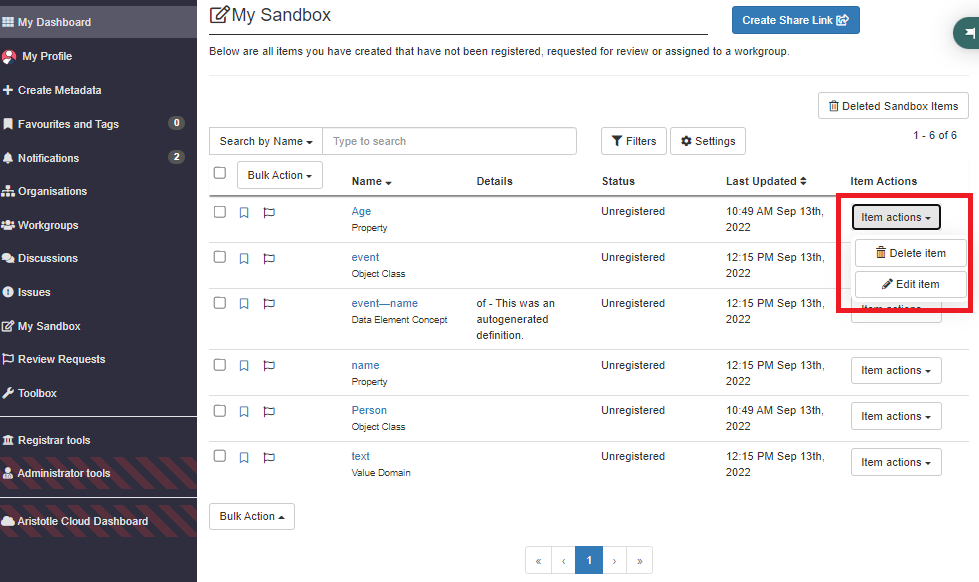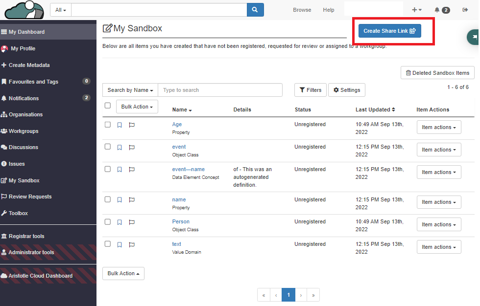 'Create Share Link' - This is where you can share your Sandbox contents with other authenticated users of the system, you can revoke these permissions at any time and other users will not be able to edit or delete items from here, only viewing privileges.