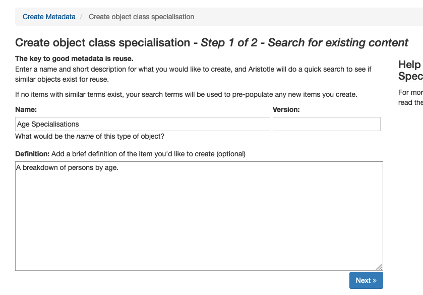 The Aristotle Ontology Tools metadata extension must be enabled from the Aristotle Cloud Dashboard, this enables the Object Class Specialisations to be created from the Create New Metadata page.