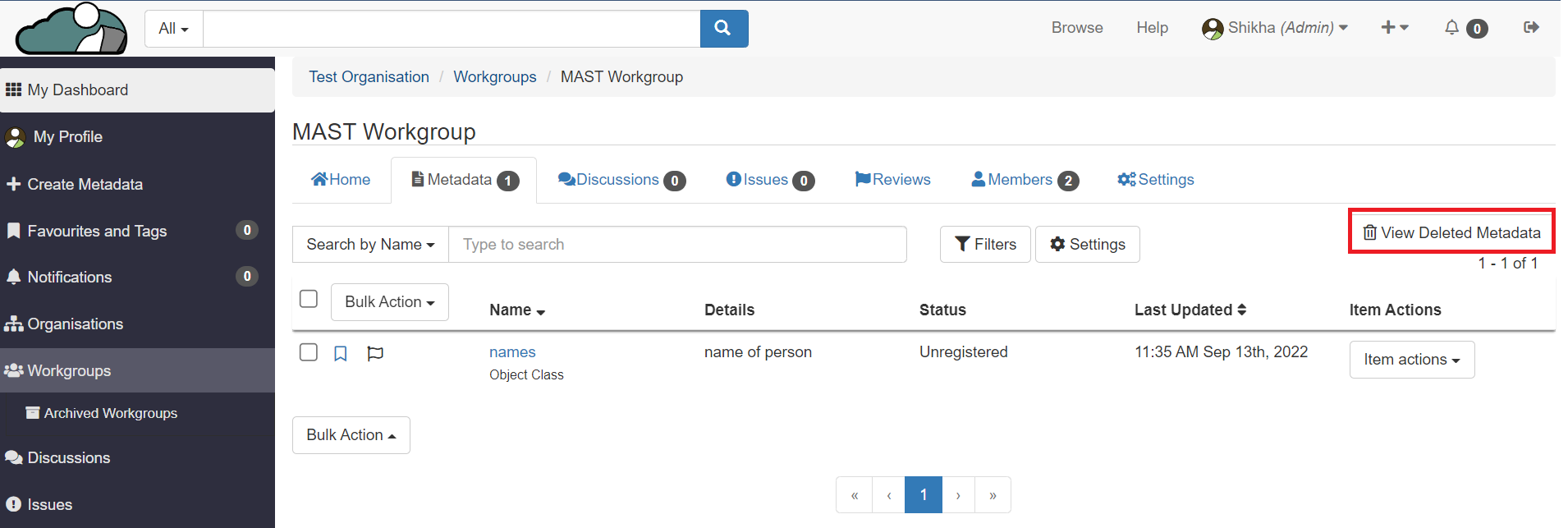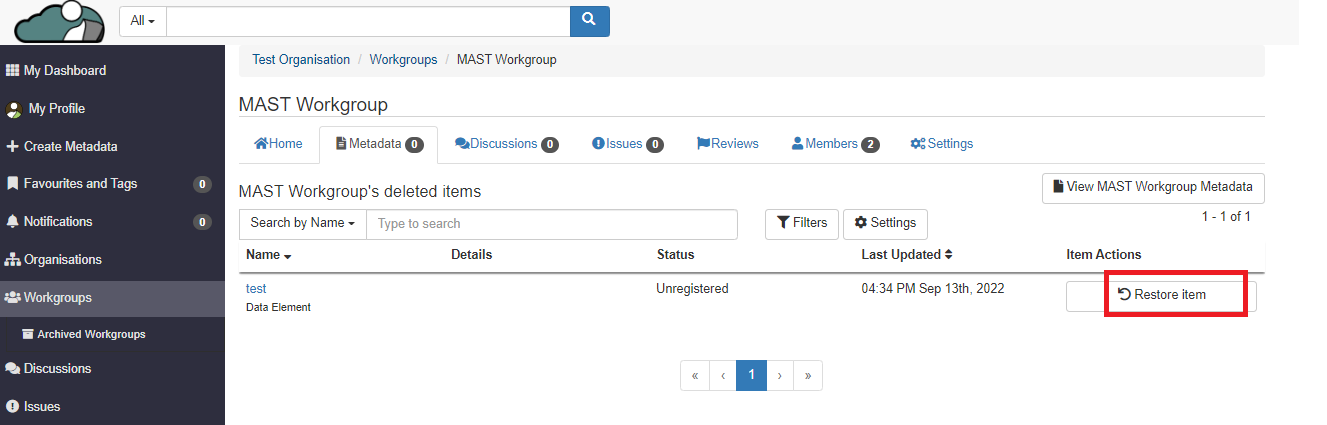 1. From the metadata page of a workgroup you are a member of, click on the ‘View Deleted Metadata’ button.