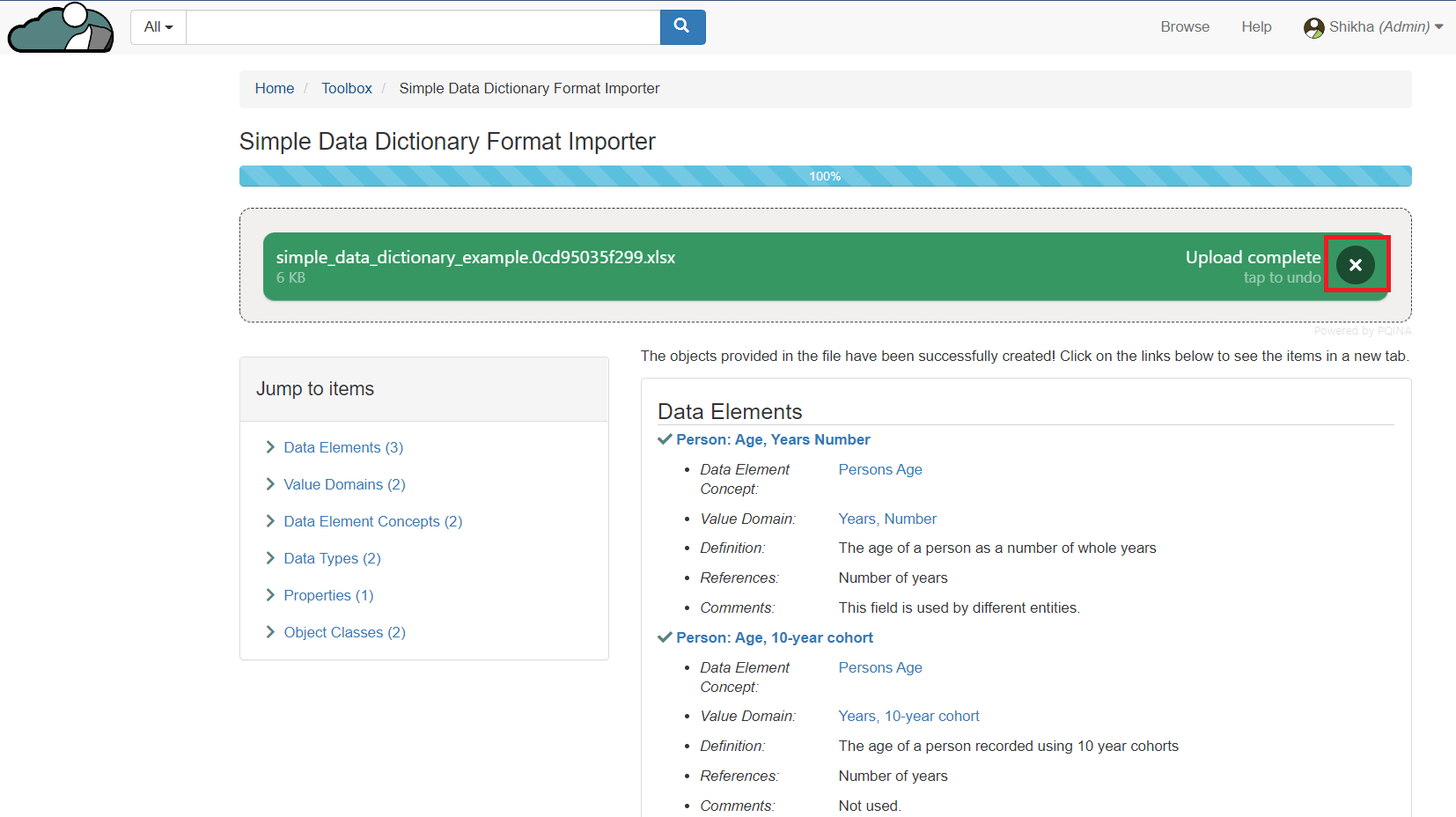 6\. After saving metadata, the percentage bar will show 100% and the bulk data element upload is complete. If you want to undo the bulk upload, click on the "X" and it will undo the changes.