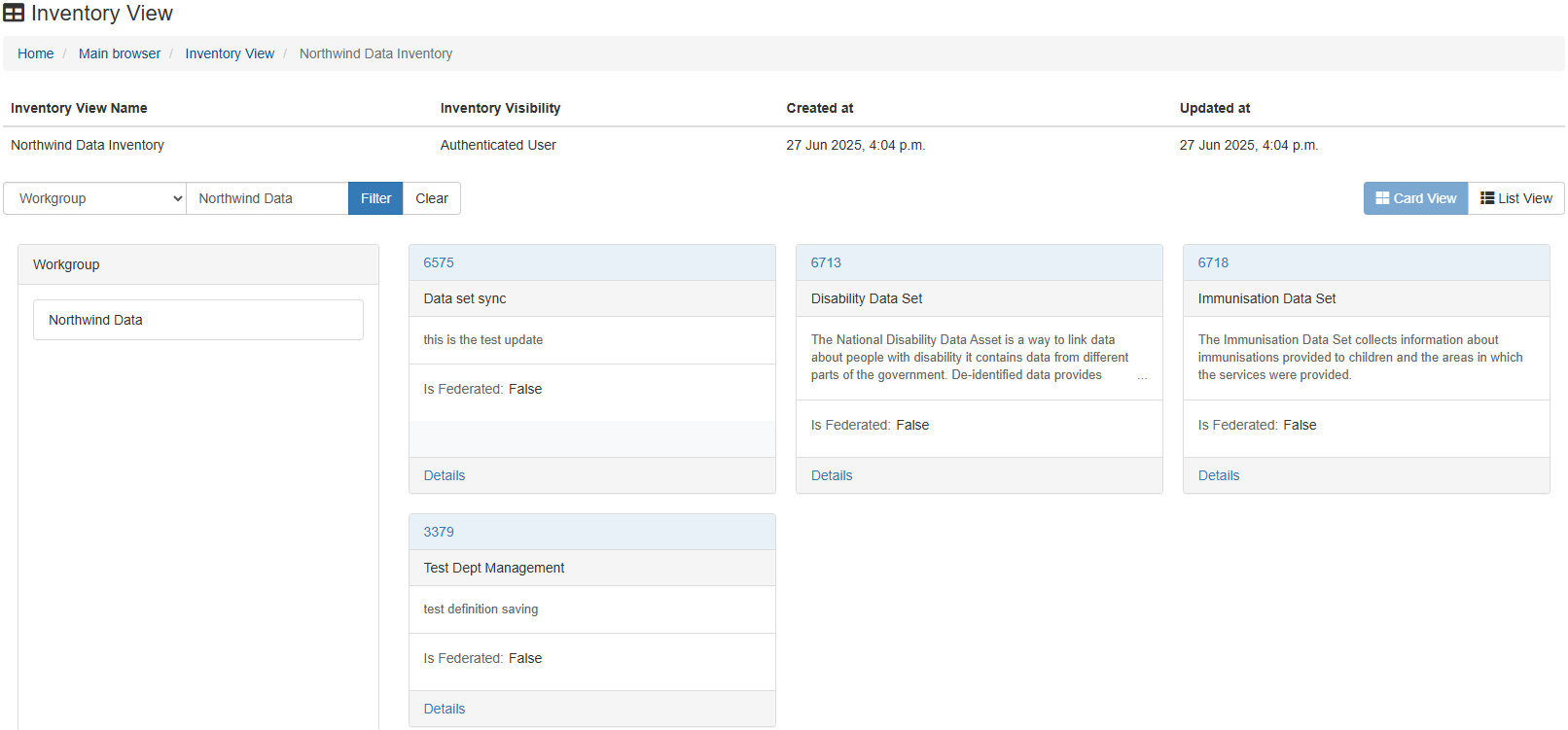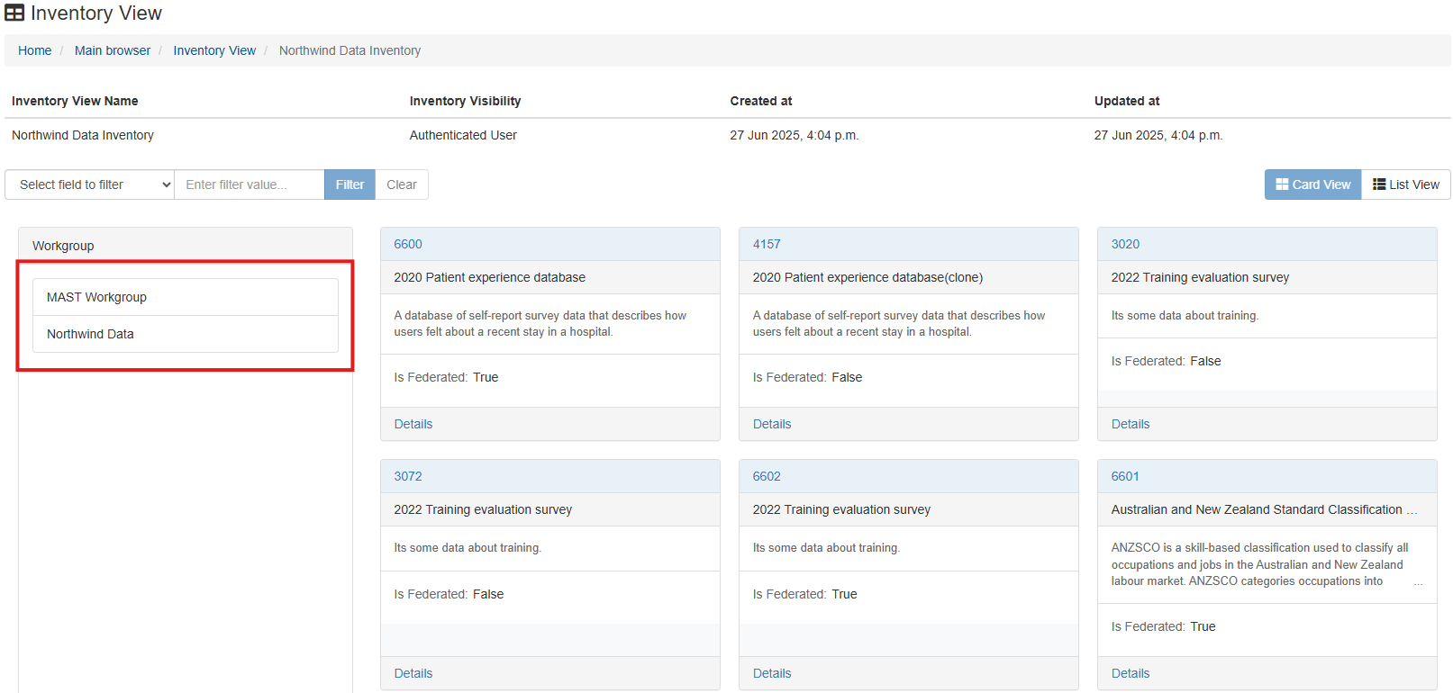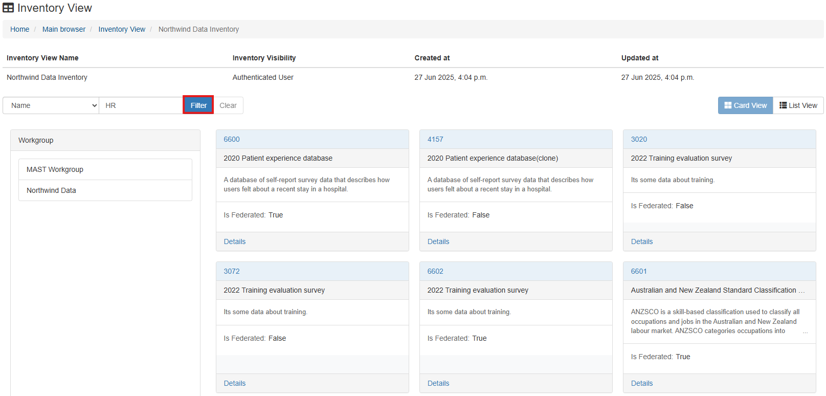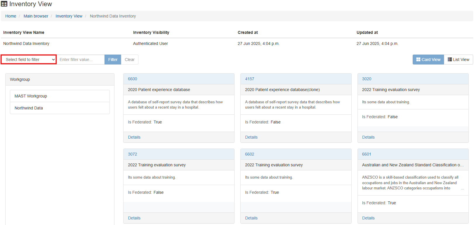 Inventories can be viewed in either card, or list viewing modes. Regardless of the viewing mode set as default during configuration, these views can be accessed and swapped between at any time for a given data inventory.