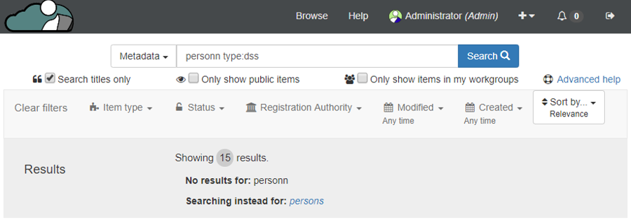 When searching Aristotle-MDR performs spellchecks against search terms, and if there is a low number of results will recommend an alternate search term. Along with this, if a search returns zero results, Aristotle-MDR will remove any filters such as item type or date restrictions to automatically broaden the search corpus. Any time the search is changed, such as spelling correction or filter removal, a notification will appear under the search bar to let users know.