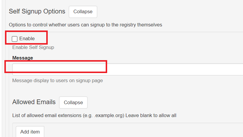 2\. Toggle the 'Enable' checkbox as desired to enable or disable self sign-up. If desired, you can also use the 'Message' field to add a message that will appear when a user selects the "Sign Up" option from the registry landing page.