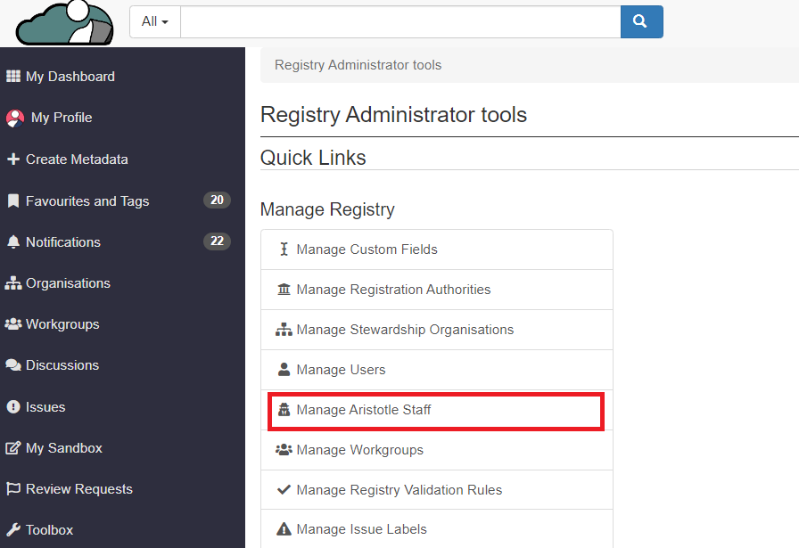 To grant the permissions to Aristotle staff, users need to be an administrator of the registry.