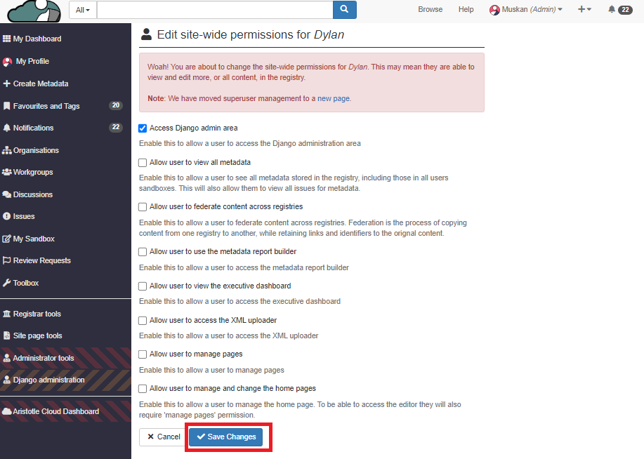 4. Select the box to update the superuser permission for the Aristotle staff on the platform.