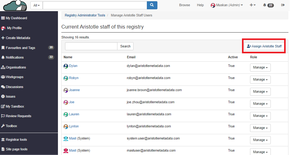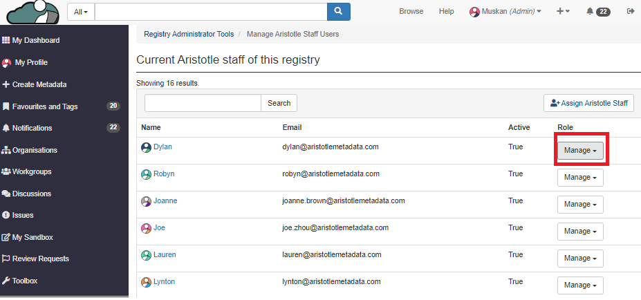 2. Click on "Manage Aristotle staff".