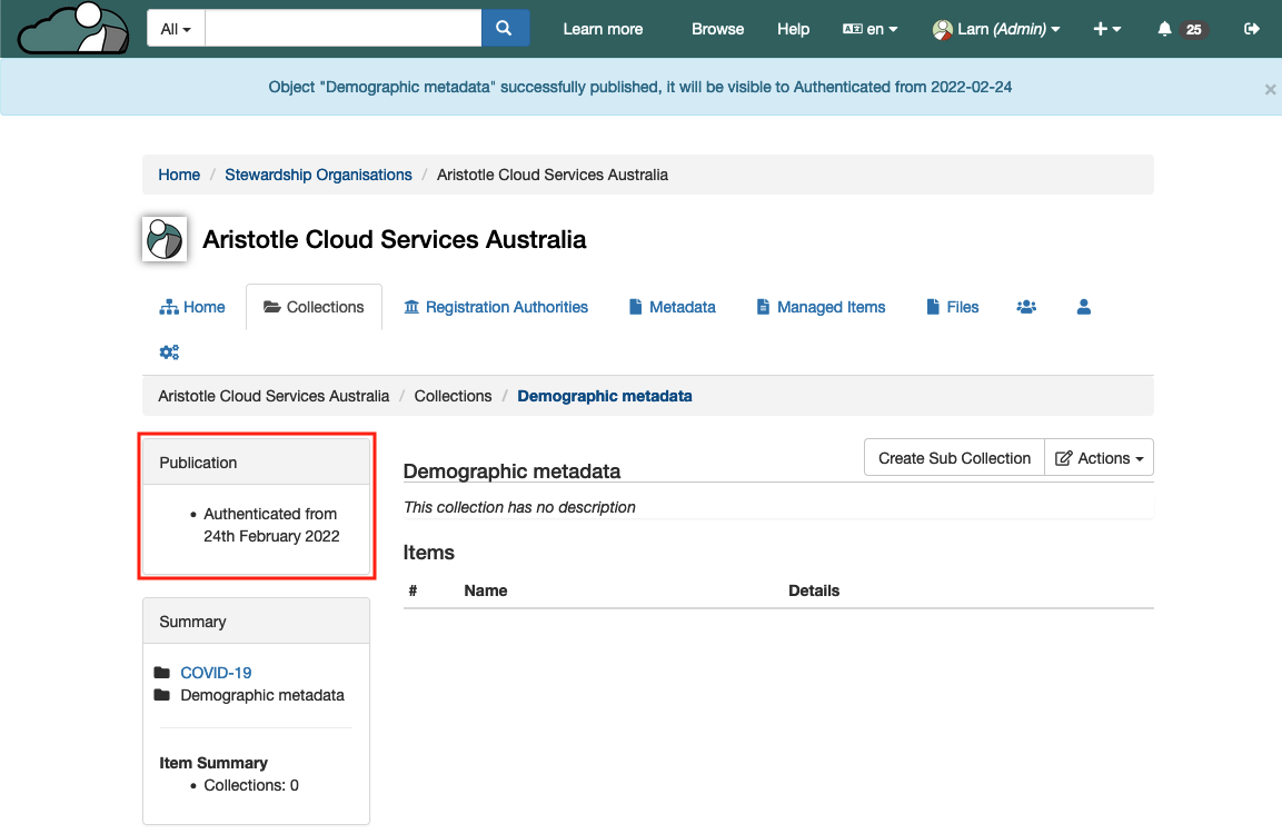 Once you've selected the Permissions for the Collection, select ![](https://help.aristotlemetadata.com/galleryDocuments/edbsn311b17045207c3164fe871497579f214154248894f46b9cbd8fee030f8c746c304370e80cf6ecff1ce4cf3d8ebfccc157c0841adf7379114d1b62bc0a20a2fec?inline=true) to save. The information on who has permissions to view the Collection will now show up in the 'Publication box' of the Collections page of the Stewardship Organisation.&#x20;