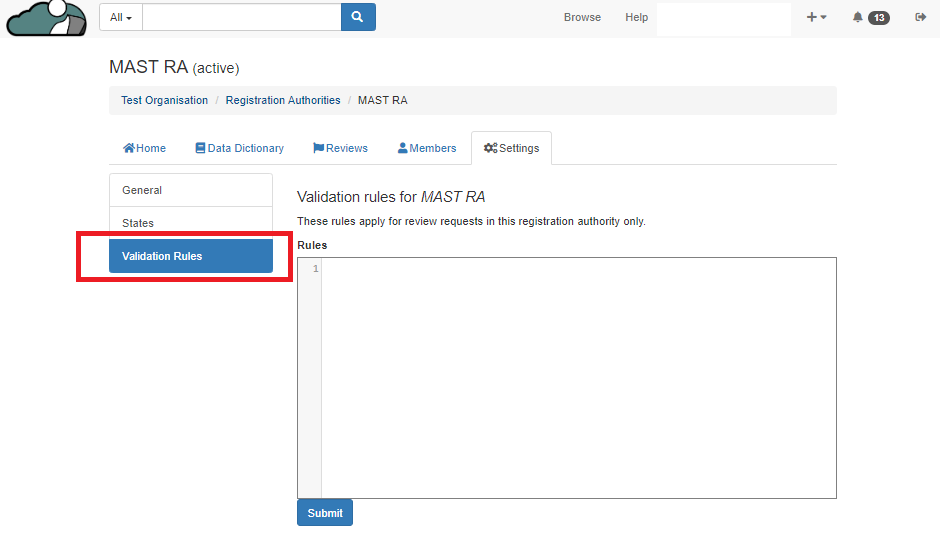* **Validation Rules:** You can add Validation Rules to the Registration Authority from here. Validation Rules are where you can add in specific validators to check against any items that are trying to be registered within this Registration Authority.