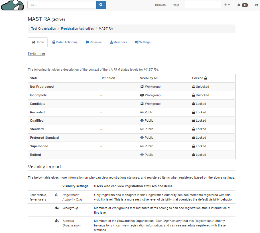 * **States:** From the left side of the Settings page, you are also be able to edit the Registration Authority States. From here, you can edit the Visibility level, whether it's Locked or Unlocked at the chosen Visibility, and the Description for the State.