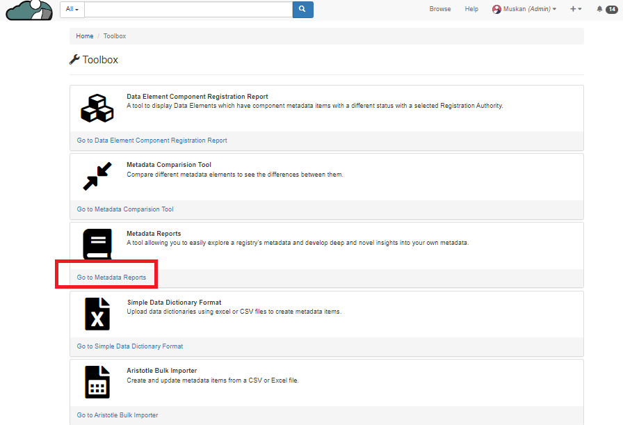 2\. Click on "Go to Metadata Reports" under Metadata Reports on the Toolbox page.