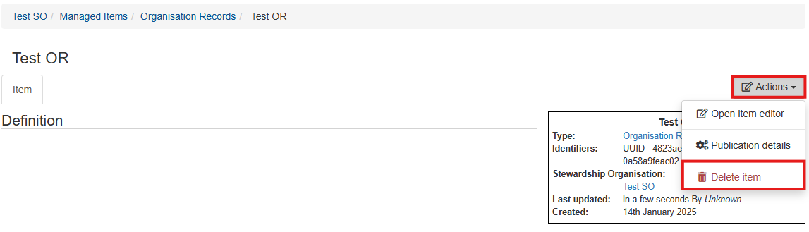 11. **If you wish to delete an organisation record**, select its 'Actions' dropdown, then 'Delete item'.