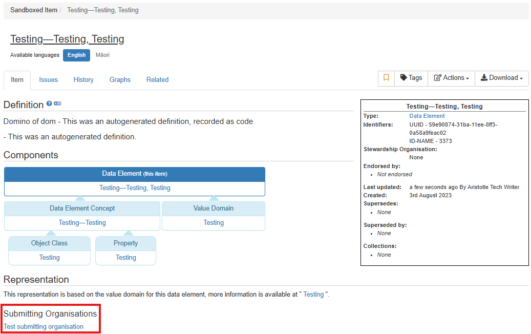 7. The linked organisation record will now appear on the item's page.