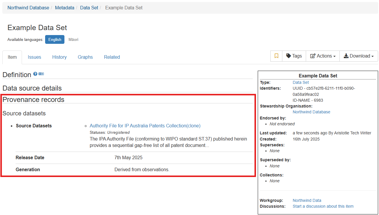 Data lineage can be recorded for a data set via its item editor, capturing what other data set(s) the item may be informed by or have historically been a part of.
