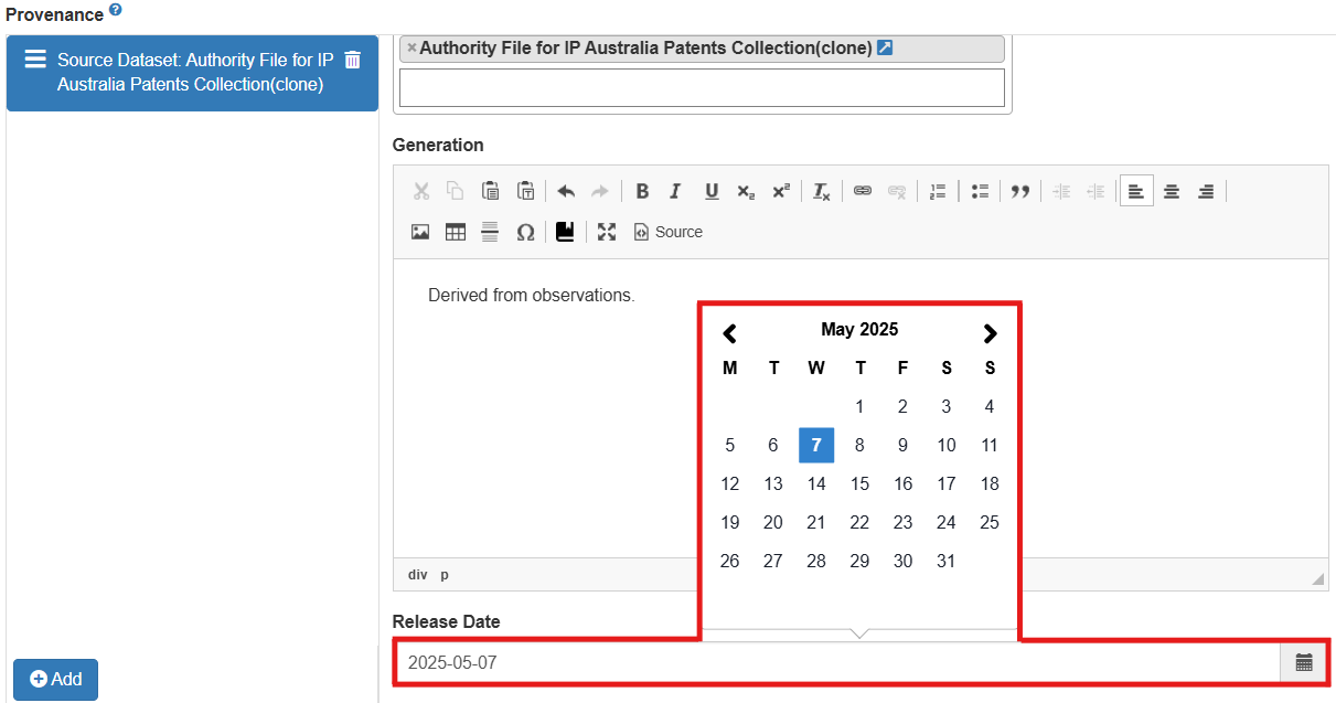 6. **If you wish to record the data set's release date**, do so using the 'Release Date' dropdown.