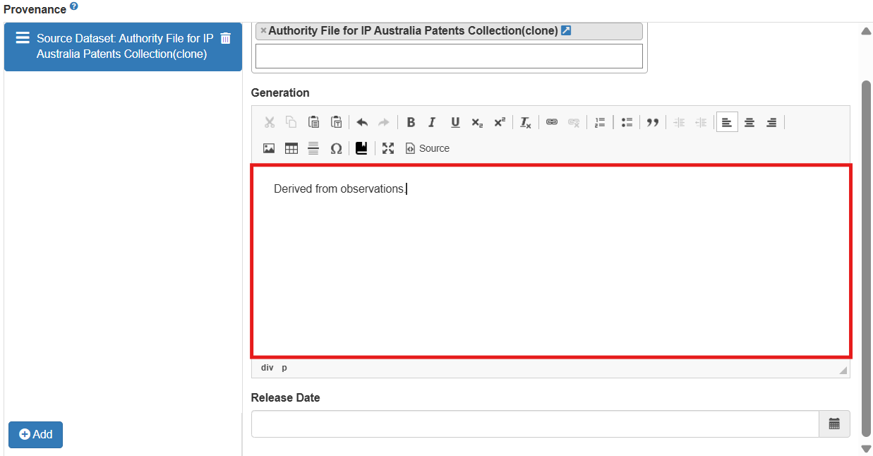 5. **If you wish to record the data set's method of generation**, populate the 'Generation' field with the relevant method.
