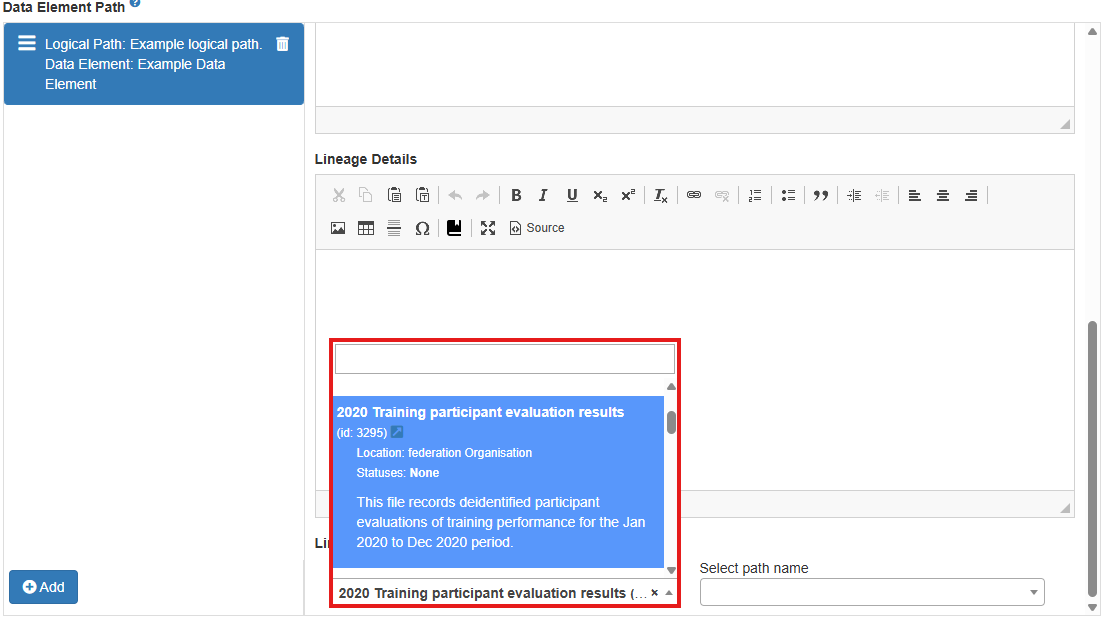 6. **If you wish to describe the logical path between this data element and distribution**, do so using the 'Logical Path' field. Logical paths contextualise a data element's contribution to a distribution, and are often as simple as the title of a column of data.