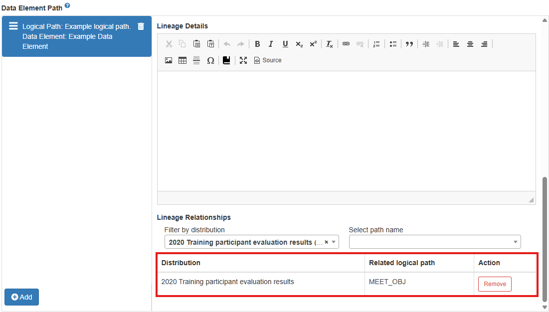 Distribution lineage can also be linked to any data elements that describe a column or field within a distribution via data element paths.
