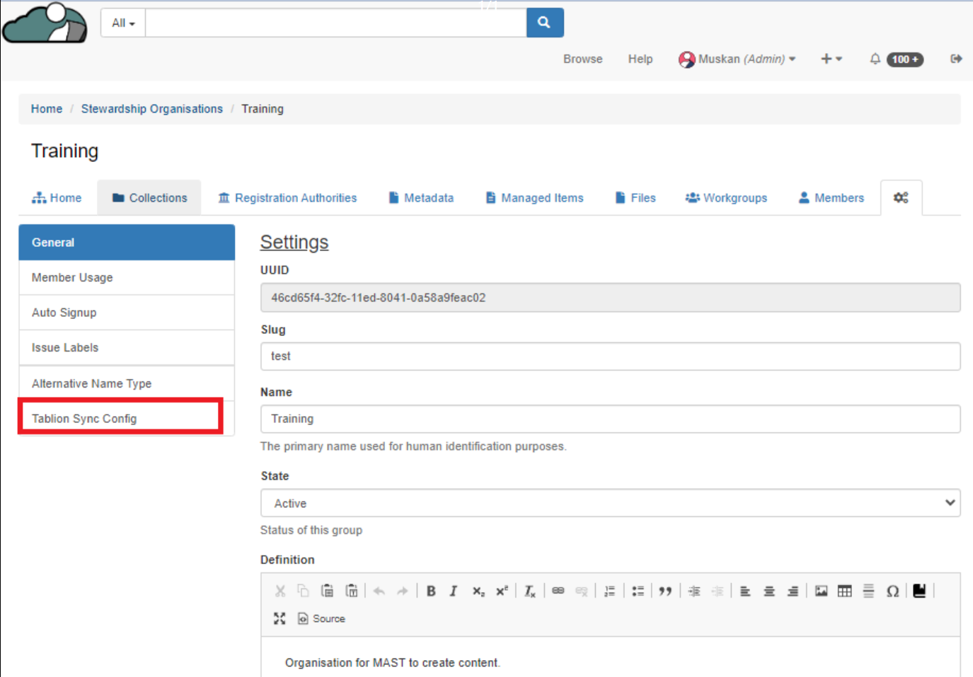 User must have Administrator permissions in both Tablion and the Aristotle Metadata Registry.