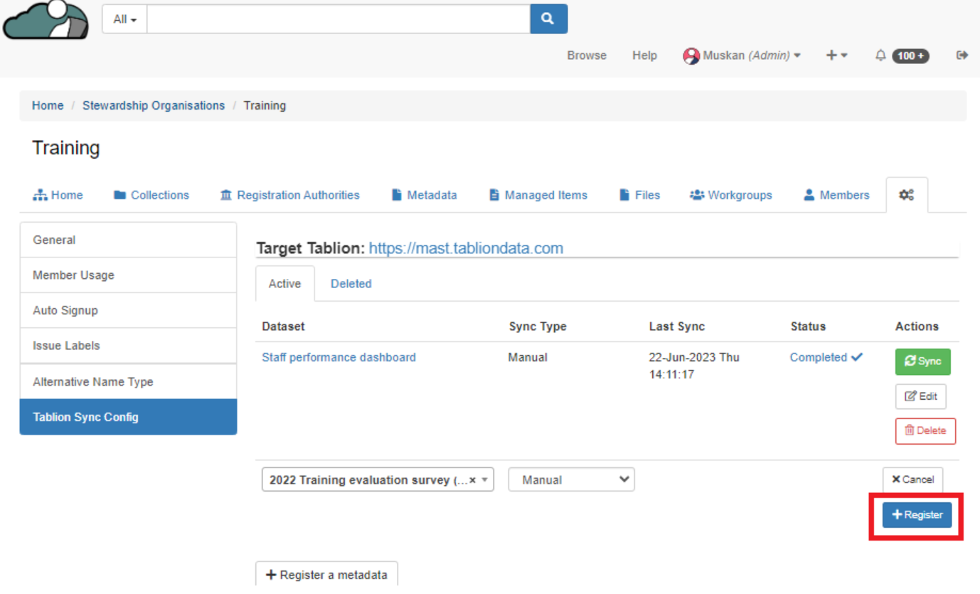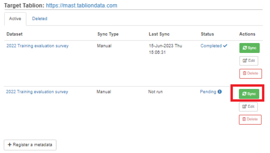 * **Manual Sync:** If users choose this option, they are responsible for manually initiating the dataset update in Tablion when desired. This means that changes made to the metadata in Aristotle will not be automatically reflected in Tablion. Instead, the user must manually trigger the synchronisation process to update the dataset in Tablion based on the latest metadata changes from Aristotle.